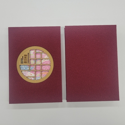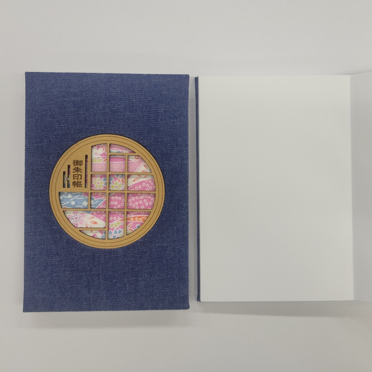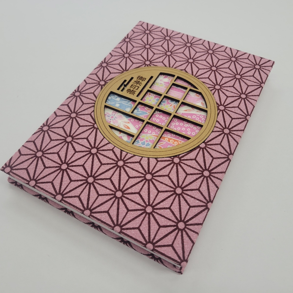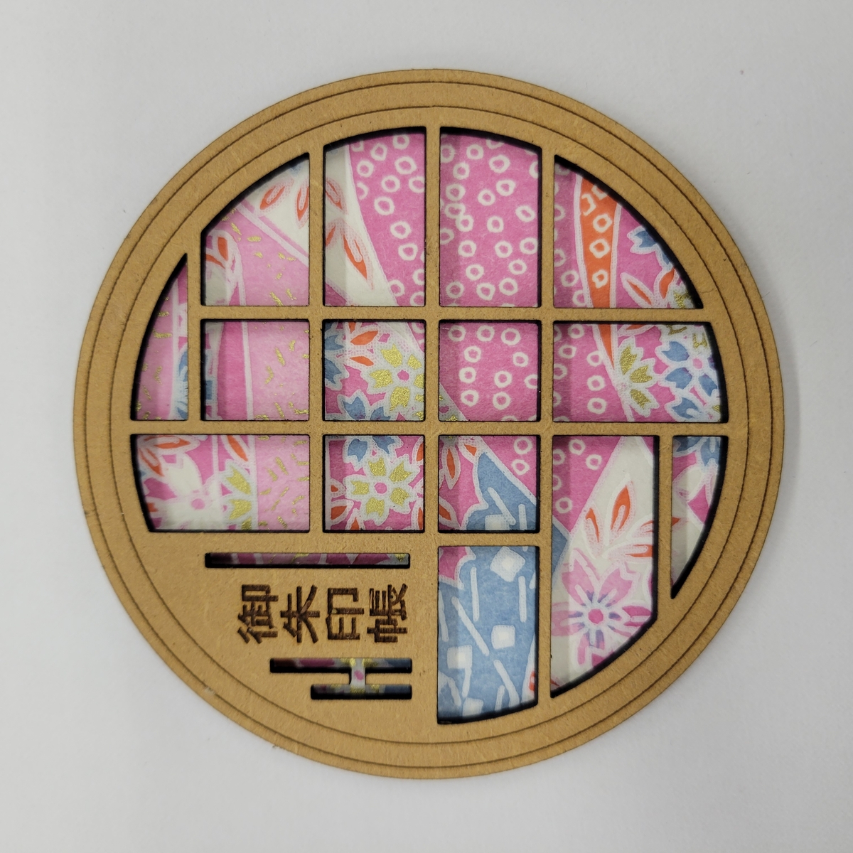 手触りの良いおにちりめんの表紙に木枠の丸窓をはめ込んだ御朱印帳です。窓の奥には色鮮やかな手染め友禅和紙をいれました。表紙の色は10種類以上の中から選べます。中は日本製の奉書紙のじゃばら式折本(24折48頁)で一般的な御朱印帳の大判サイズです。
