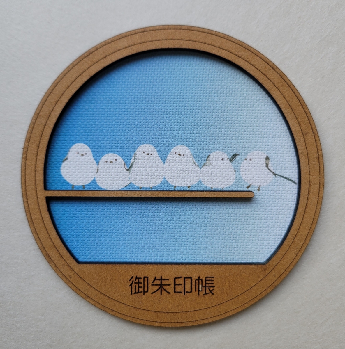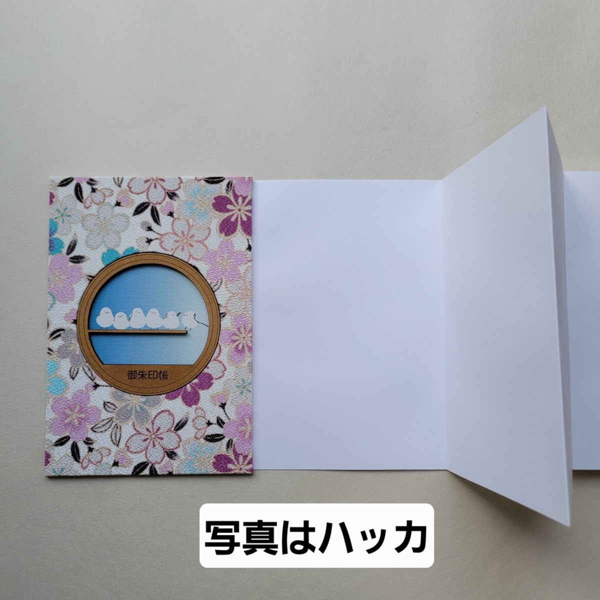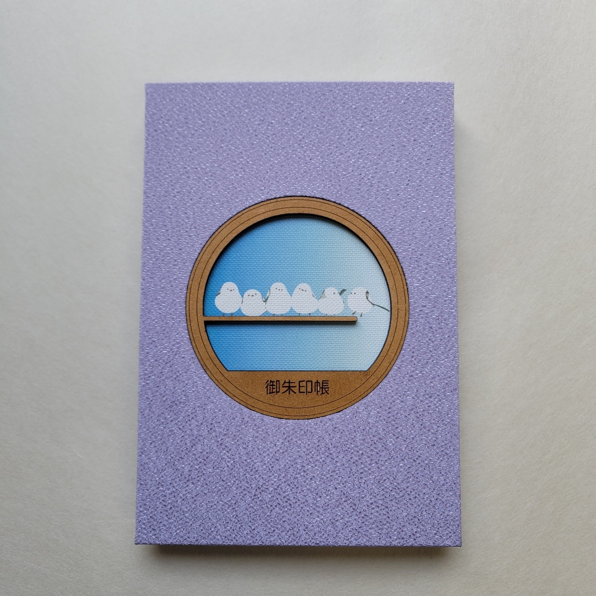 手触りの良いおにちりめんの表紙に木枠の丸窓をはめ込んだ御朱印帳です。窓の奥には枝に並んだしまえなが達のイラストをいれました。表紙の色は10色以上あります。中は日本製の奉書紙のじゃばら式折本(24折48頁)で一般的な御朱印帳の大判サイズです。
